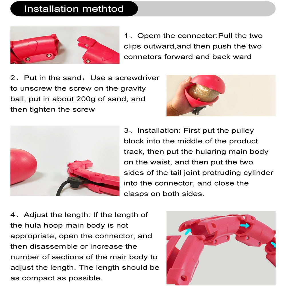 Wide Application & Attentions: Almost suitable for all adults and kids but not the elderly or baby. Suitable for people who need to lose weight/abdominal fat/mothers/office workers/students. Before exercising, ensure the weighted hoop linking done and wear the close-fitting clothes; When exercising, pay attention to the swing range of the weight ball to avoid hitting others or the furniture. At the same time, don't be too heavy when it is used for the first time