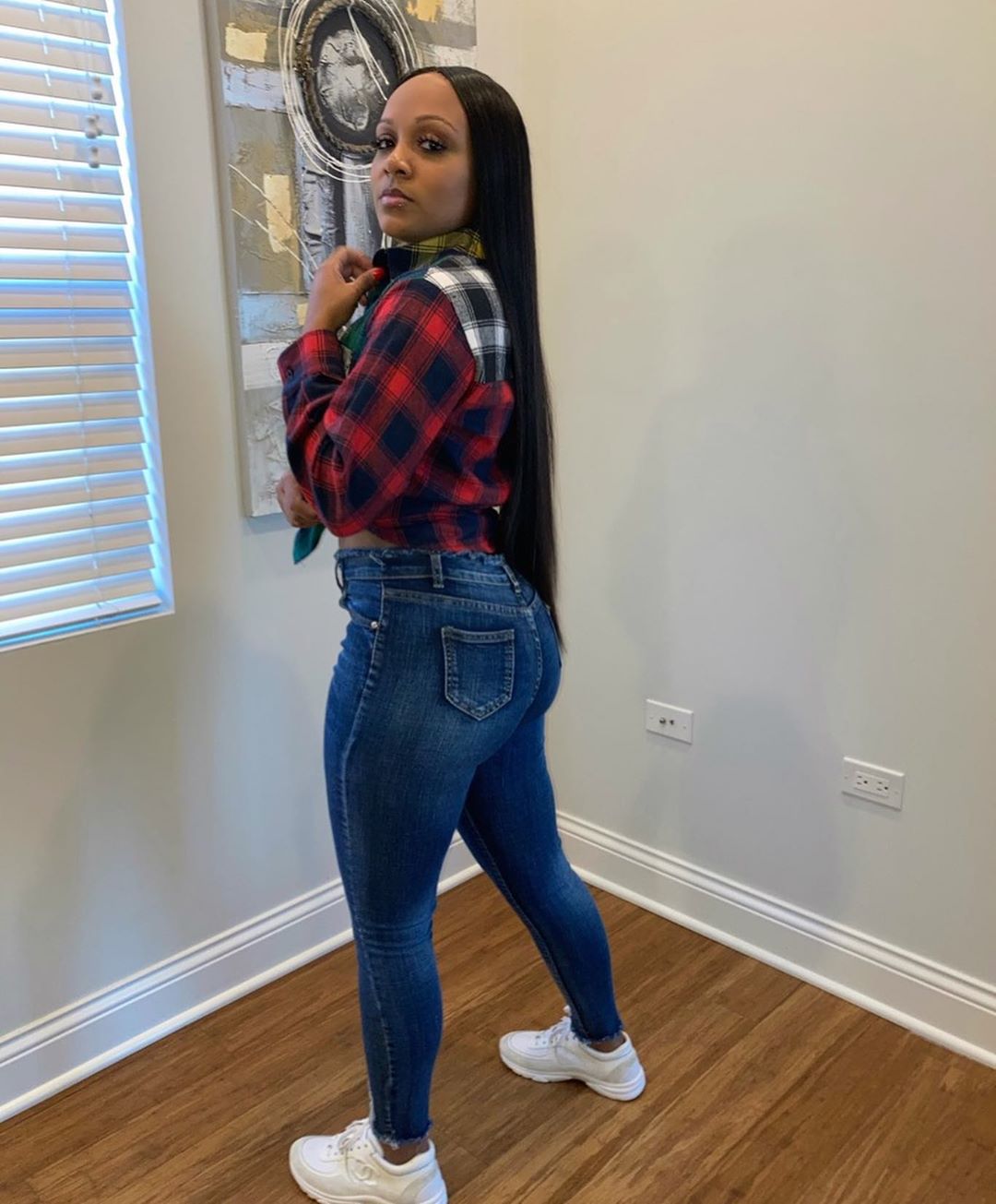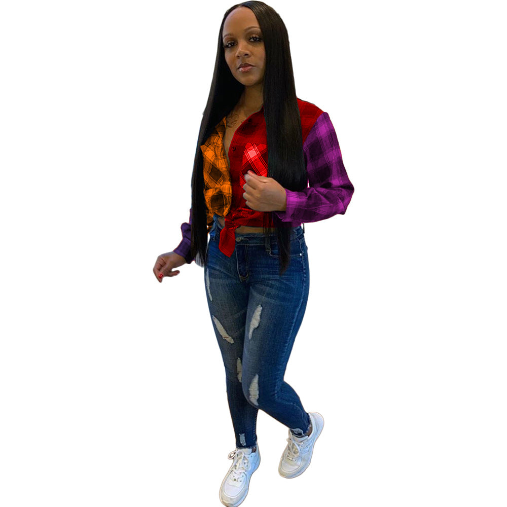 Plaid stitching long sleeve plus size women's clothing